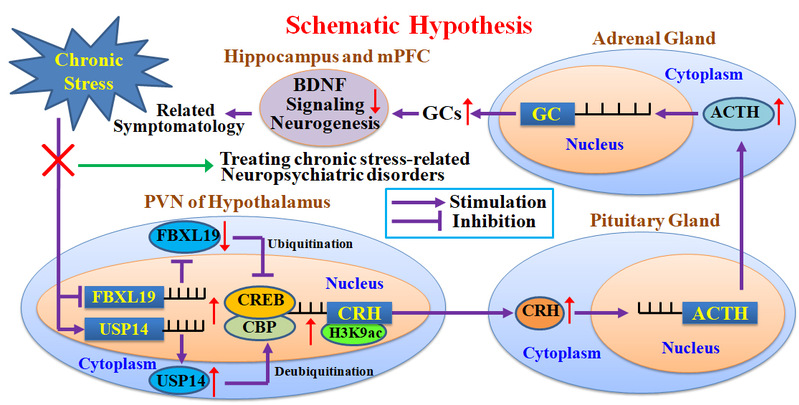 江波教授课题组长期致力于抑郁症病理生理机制的相关研究,聚焦寻找新型抗抑郁靶点及筛选新型抗抑郁药物。迄今,慢性应激促进室旁核(PVN)内促肾上腺皮质激素释放激素(CRH)过度表达的确切分子机制尚不完全清楚。既往研究表明,cAMP反应元件结合蛋白(CREB)结合蛋白(CBP)直接参与CRH表达的调控。CBP的泛素化/降解与去泛素化/稳定化过程分别受F盒富含亮氨酸重复序列蛋白19(FBXL19)与泛素特异性肽酶14(USP14)调控。课题组提出假说:PVN中的FBXL19-USP14-CBP系统可能参与慢性应激诱导的CRH释放;并采用多种方法进行验证。结果显示,慢性社会挫败应激(CSDS)和慢性不可预见性温和应激(CUMS)均可引起小鼠PVN中FBXL19–USP14–CBP系统的显著改变。在PVN中基因沉默FBXL19、基因过表达USP14/CBP以及立体定向注射TAT-USP14均能模拟慢性应激,使未应激小鼠出现类似症状,该效应由CRH生物合成增加所介导,且同时依赖于CBP‒CREB相互作用及CBP的乙酰转移酶活性。反之,在PVN中基因过表达FBXL19、基因沉默USP14/CBP可逆转小鼠的慢性应激诱导症状。同样,向PVN立体定向注射TAT-FBXL19及腹腔注射USP14抑制剂IU1也能逆转小鼠的慢性应激诱导症状。此外,基因敲除USP14与FBXL19分别可预防和加重慢性应激诱导的小鼠症状。综上,PVN神经元中的FBXL19、USP14以及CBP皆与慢性应激相关,它们有望成为治疗抑郁症等慢性应激相关神经精神疾病的潜在靶点。