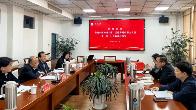 11月4日,南通市政协副主席、民建市委会主委张一峰一行来校交流。校党委书记杨宇民,校党委副书记王卫东,校党委常委、统战部部长朱城出席座谈会。