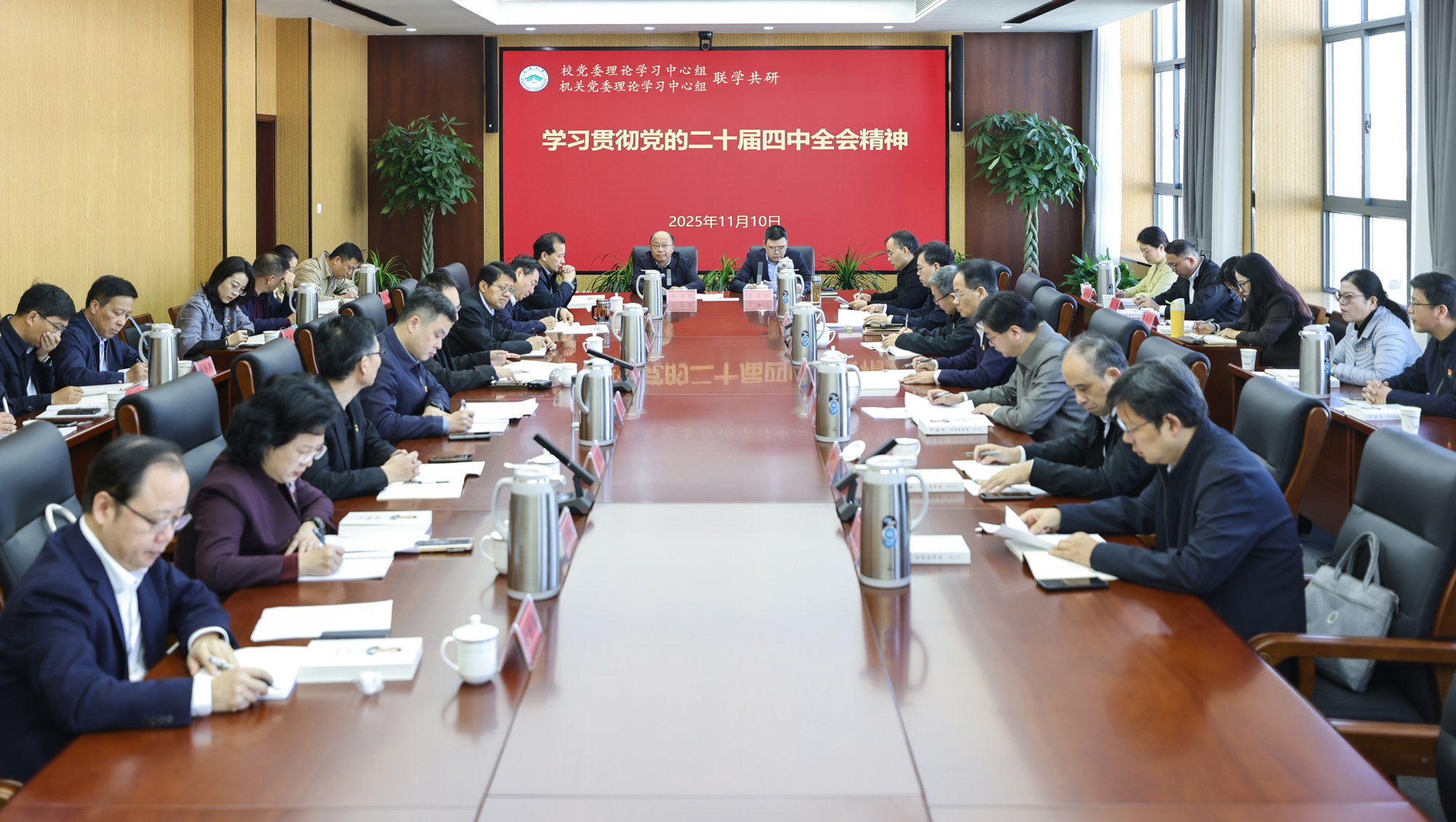 杨宇民指出,党的二十届四中全会是在即将进入基本实现社会主义现代化夯实基础、全面发力的关键时期召开的一次十分重要的会议。全会审议通过的《建议》,对未来五年发展作出顶层设计和战略擘画,是乘势而上、接续推进中国式现代化建设的又一次总动员、总部署,是“十五五”时期以中国式现代化全面推进强国建设、民族复兴伟业的纲领性文件和行动指南,对于动员和激励全党全国人民续写“两大奇迹”新篇章、奋力开创中国式现代化新局面具有重大意义,对于学校未来发展具有重要的科学指引作用。杨宇民强调,《习近平谈治国理政》第五卷是新时代中国共产党人坚持和发展中国特色社会主义的最新理论结晶,生动记录了习近平总书记带领党和人民继续进行伟大斗争、建设伟大工程、推进伟大事业、实现伟大梦想的历史进程,饱含习近平总书记治国理政的深邃思考和使命担当,蕴含着思想伟力、真理伟力、实践伟力。学习好、领会好、贯彻好《习近平谈治国理政》第五卷,对于加快建设教育强国、更好支撑引领中国式现代化意义重大,是当前和今后一个时期的重要政治任务。