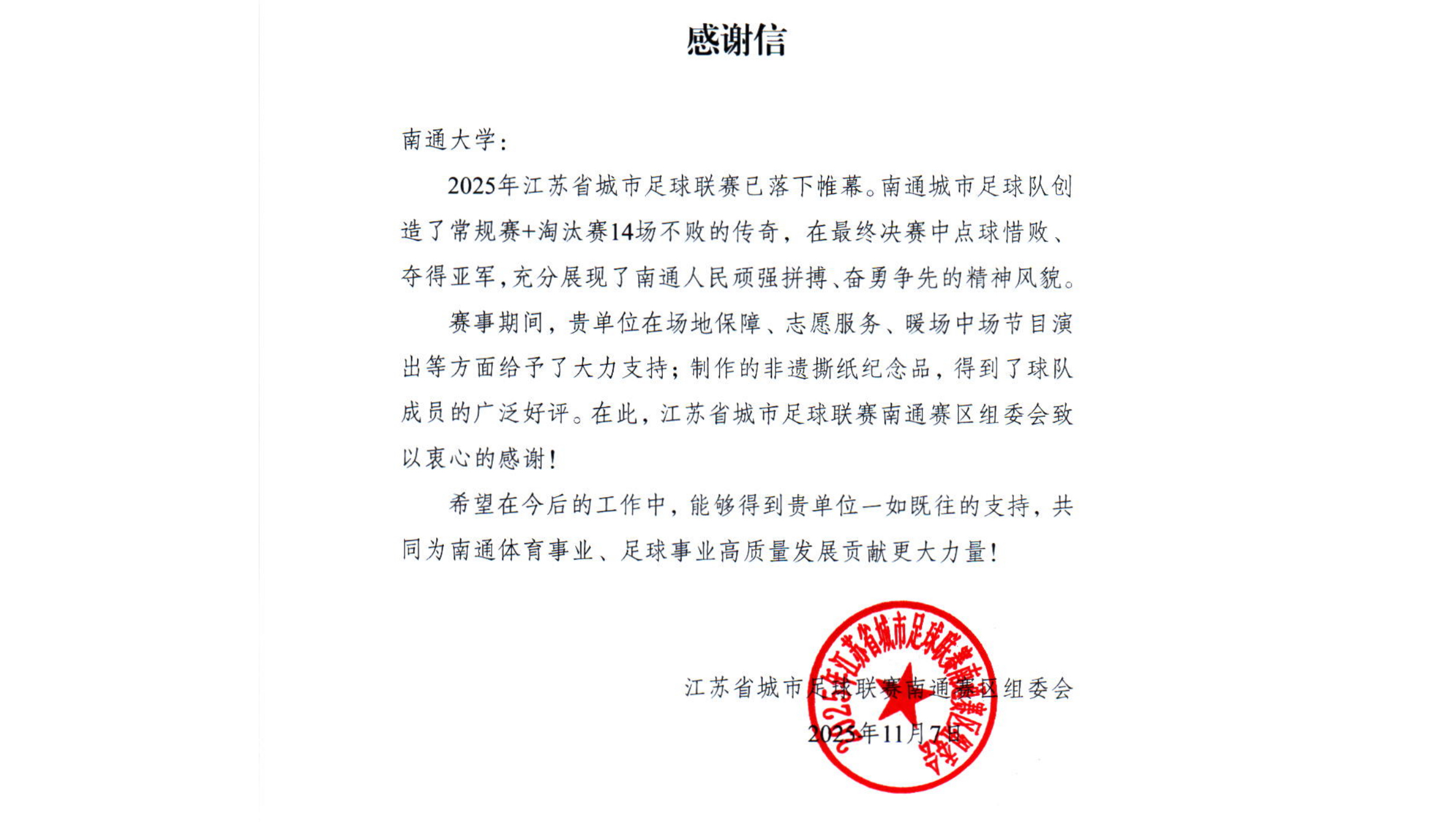 近日,江苏省城市足球联赛南通赛区组委会向BEAT365发来感谢信,对学校在赛事期间提供的全方位支持致以诚挚谢意。