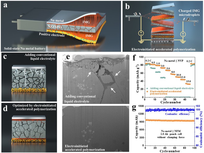 面对新一代高安全、高能量密度储能体系的迫切需求,固态电池因其优异的热稳定性和安全性被认为是最具潜力的替代技术。传统固态电解质体系普遍存在界面接触不良、离子迁移障碍及需外压维持界面稳定等关键难题,严重制约了固态电池的实际应用。杨庭舟教授团队在前期研究的基础上(Angew. Chem. Int. Ed. 2025, 64, e202505938;Adv. Mater. 2025, 37, 2504092.),创新性地引入带电“修复胶”微滴,利用电引发显著加速聚合过程,使其速率提升至原来的21.4倍。在电润湿效应的驱动下,该方法可在固态电解质界面处原位形成均匀涂层,优先填充于固态电解质表面的裂纹与孔隙,从而增强电极与固态电解质之间的界面接触稳定性,有效抑制枝晶引发的裂纹扩展。得益于此,钠离子动力学性能显著改善,临界电流密度达到6.8 mA cm⁻²,并实现超过1000次的稳定循环。基于该修复策略所构建的Ah级全固态软包电池,在无需外部夹持压力的条件下,依然展现出优异的长循环稳定性,充分验证了该界面修复工艺的可扩展性与实际应用潜力。