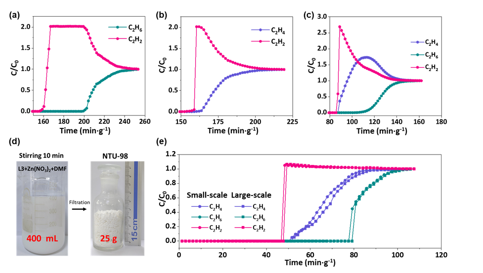 直接获取电子级乙炔被视为分离领域的重大挑战,其根源在于传统多孔材料普遍遵循“乙炔>乙烯>乙烷”的吸附偏好,难以实现从三元 C2 混合物中一步分离高纯乙炔。该研究通过配体官能团调控,实现了对该吸附顺序的完全逆转。研究者通过在吡唑—羧酸配体上引入三氟甲基和甲基基团,成功构建出一系列 MOF-5 类似结构的多孔晶体材料。其中表现最优的材料 NTU-98展现出完全反转的 C2烃类吸附趋势(乙烷>乙烯>乙炔),使其能在室温条件下,实现从三元 C2 混合进料中“一次操作”直接获得纯度超过 99.99% 的乙炔。密度泛函理论计算与气体加载晶体学分析进一步揭示了分子层面的作用机制:材料孔腔中精确定位的甲基基团显著增强了其与乙烯和乙烷的主客体相互作用,同时有效抑制了与乙炔的结合能力,从而实现选择性的完全反转。