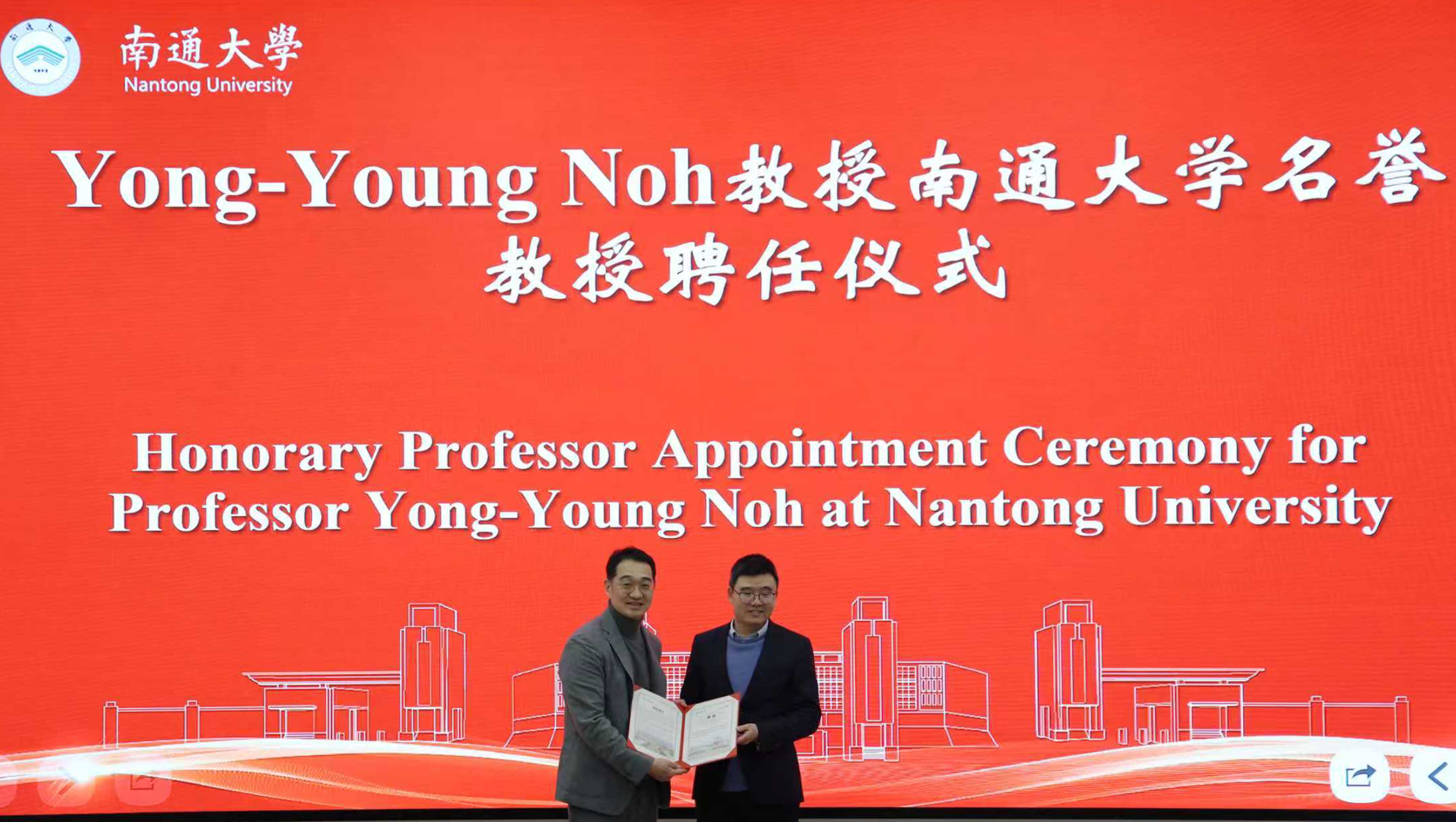 1月7日下午,BEAT365举行韩国浦项科技大学杰出教授Yong-Young Noh名誉教授聘任仪式。校长王建浦代表学校向Yong-Young Noh教授颁发聘书并佩戴校徽。