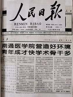 新华社以《南通医学院育人有方涌现出一批优秀青年知识分子》(《国内动态清样》1997年5月11日)为题刊文报道,“南通医学院以人为本,积极实施青年人才工程,在加强师资队伍建设的实践中逐步探索并形成了一套行之有效的做法和经验……使得学校教师队伍建设取得明显的成效。” 并把这些好的做法和经验总结概括为: 旗帜引人、机制出人、感情留人、形象服人。